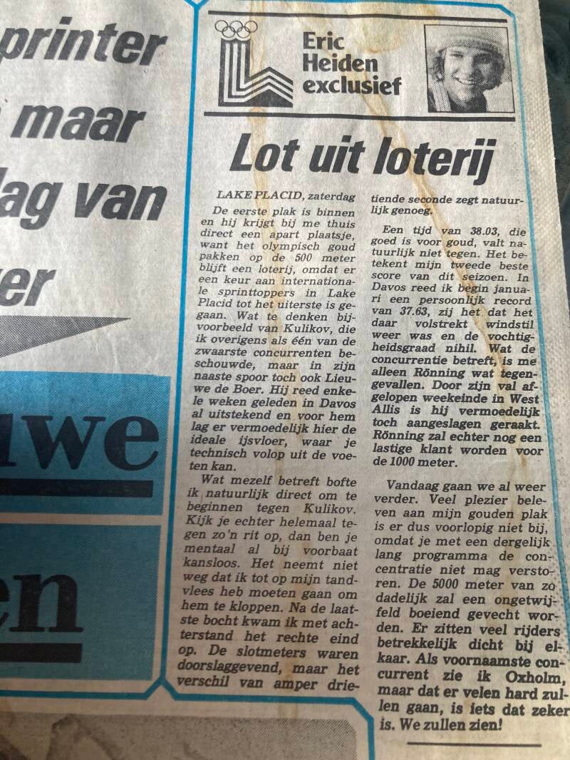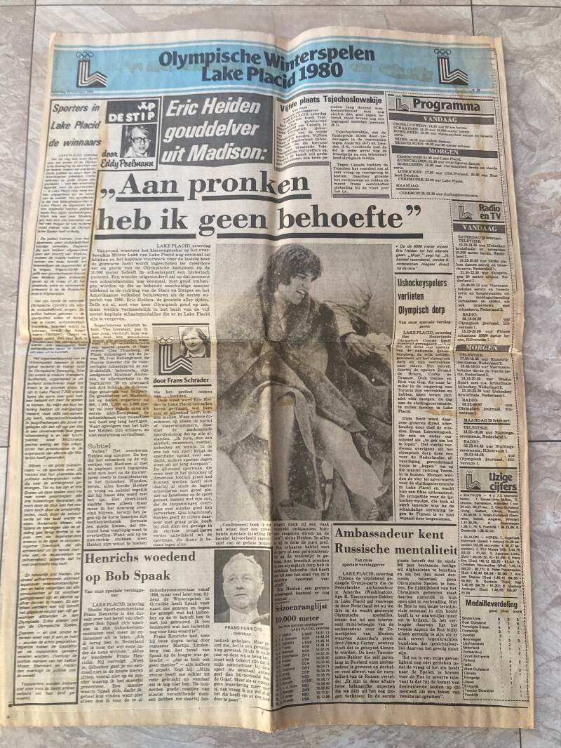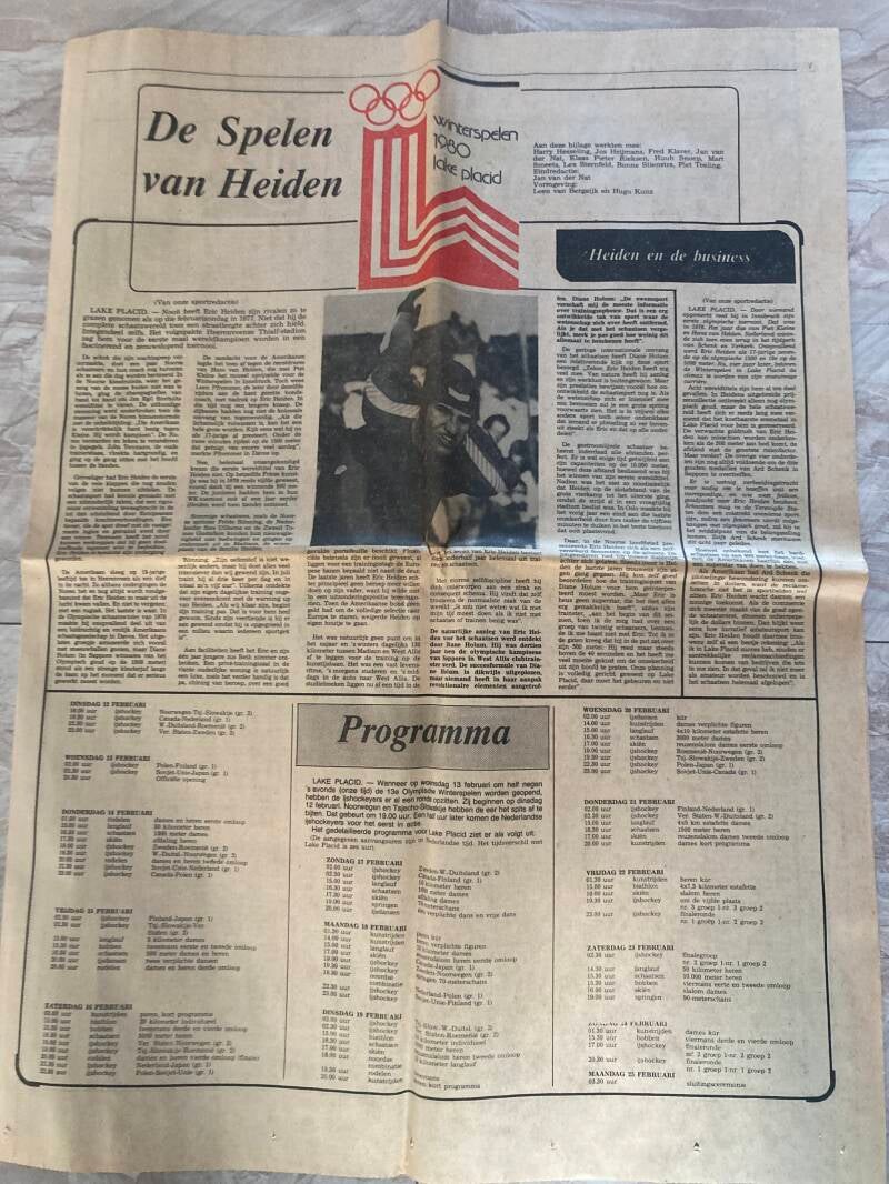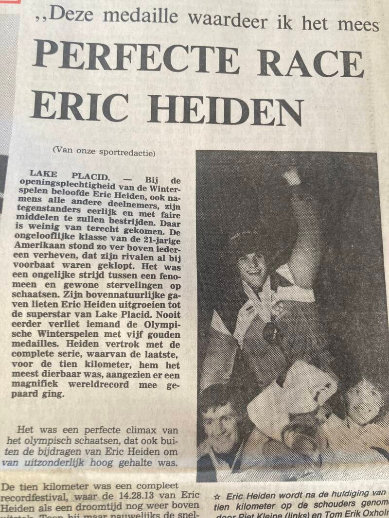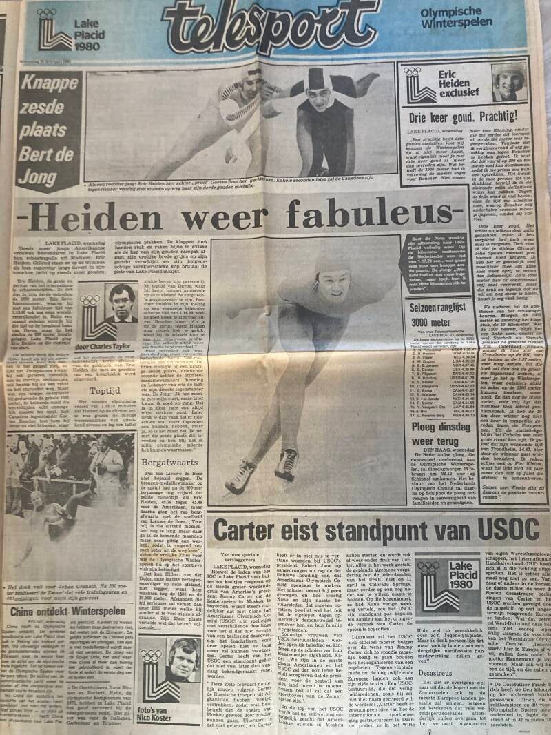 Zo kwam ik ook voor de eerste keer in aanraking met de Amerikaanse schaatser Eric Heiden. Wat een sportman! Wat een held! Ik was toen vooral onder de indruk van zijn eigen manier van trainen in zijn garage. Apparaten werden door Eric Heiden ontwikkeld waarvan we vandaag de dag nog steeds gebruik van maken, zoals de schaatsplank. Mijn moeder wist zich nog te herinneren dat ik dringend op zoek was naar een poster van Eric Heiden voor op mijn kamer, maar daar was toen niet aan te komen. Wel werden er kranten door mij verzameld waarin Eric Heiden stond vermeld. De kranten zijn ondertussen alweer 44 jaar in mijn bezit, maar nog steeds prettig om zo nu en dan deze weer eens te bekijken. Onderaan deze bladzijde zien je meer krantenartikelen.