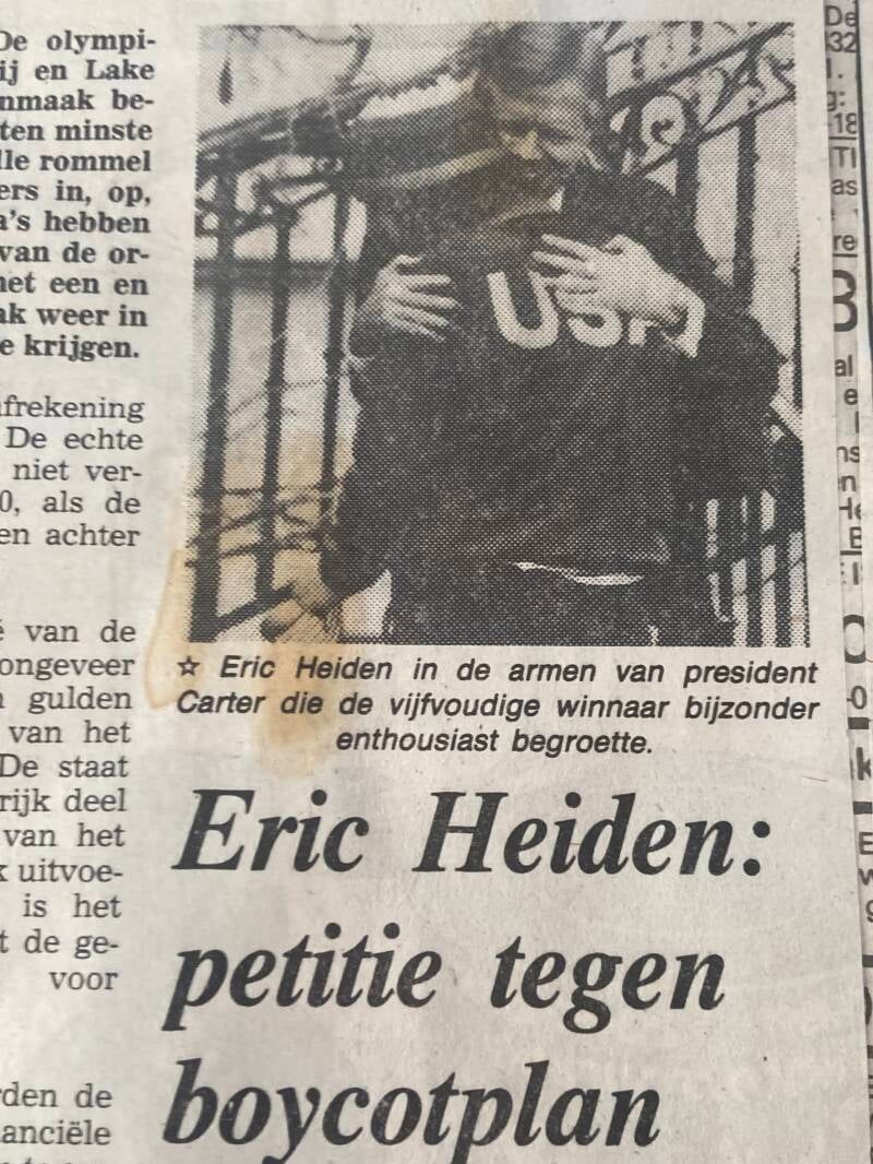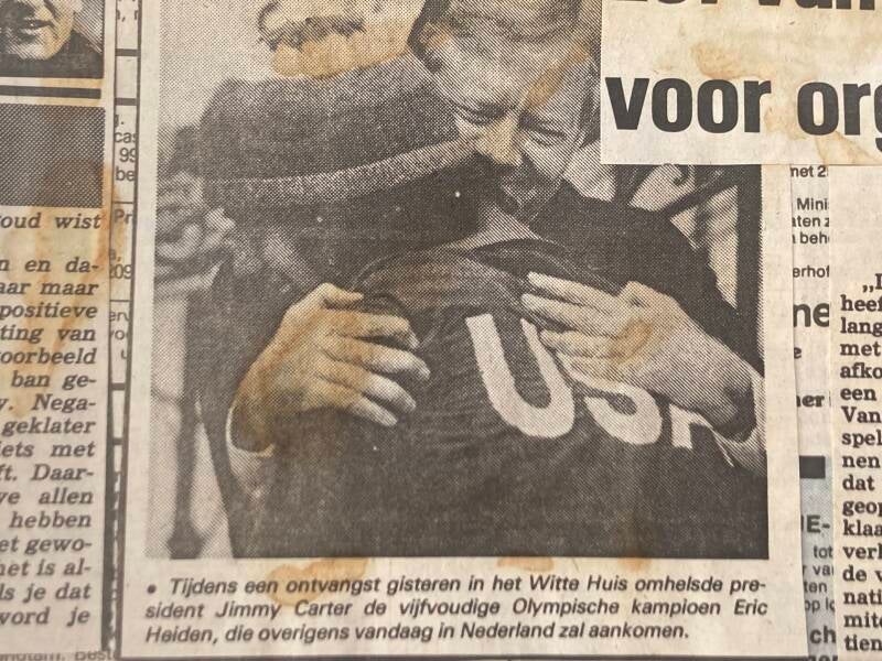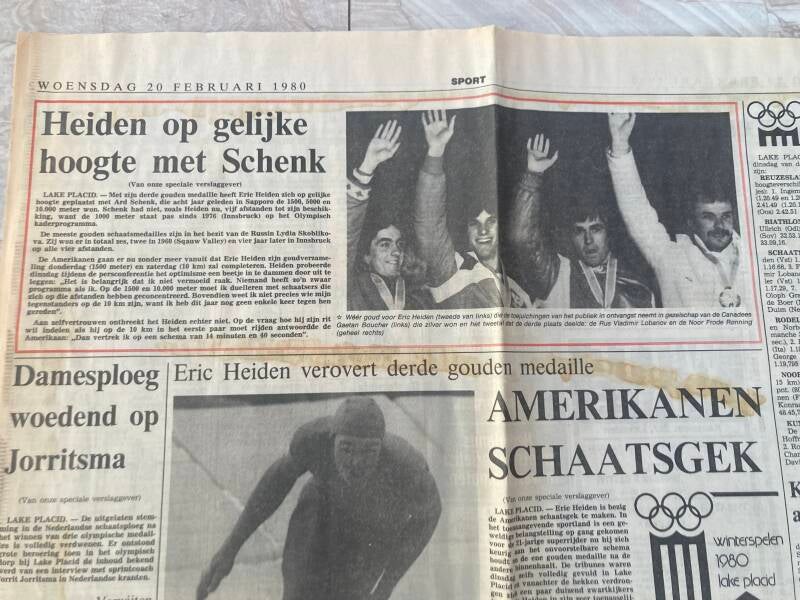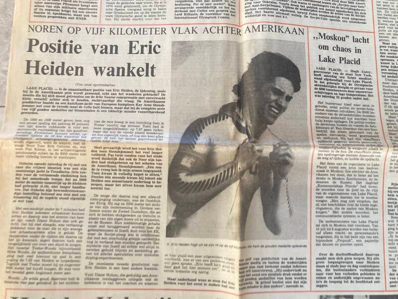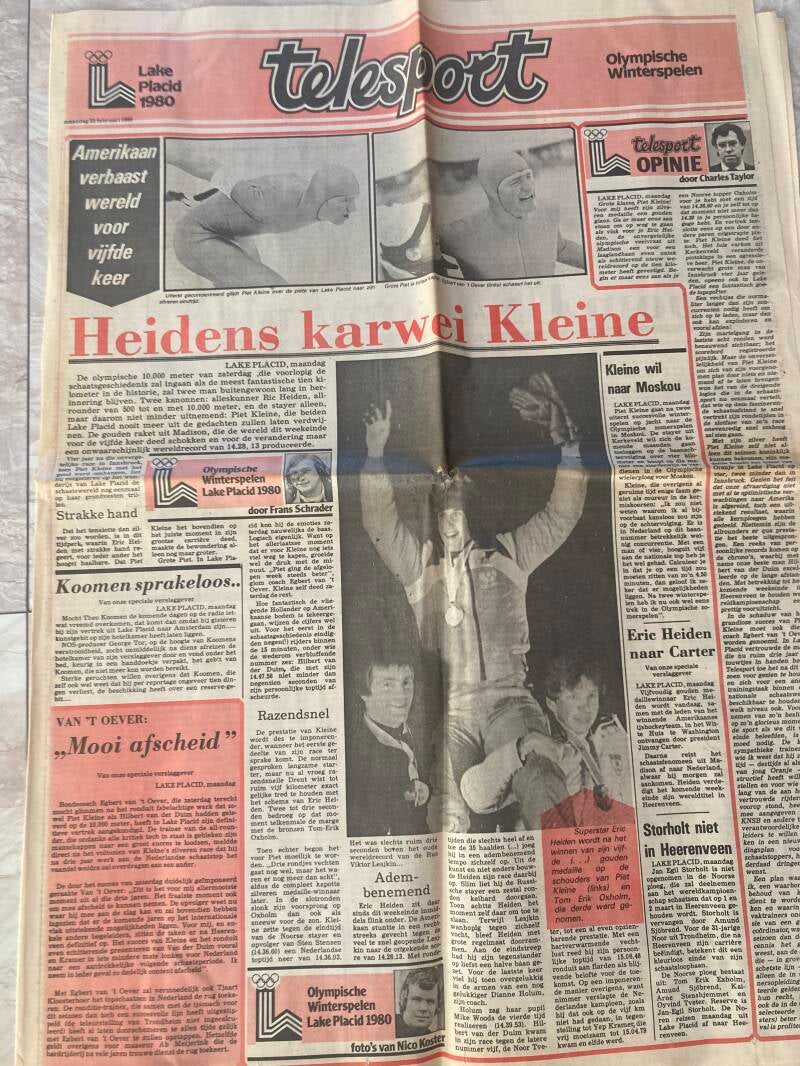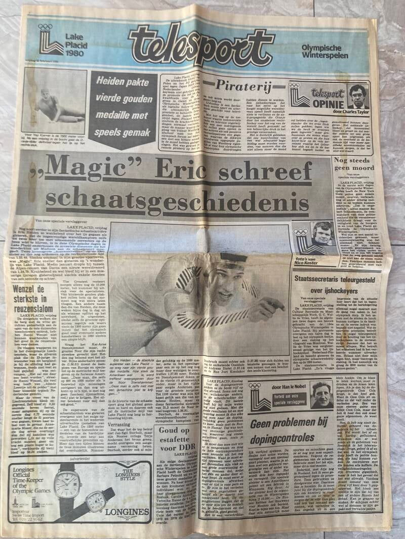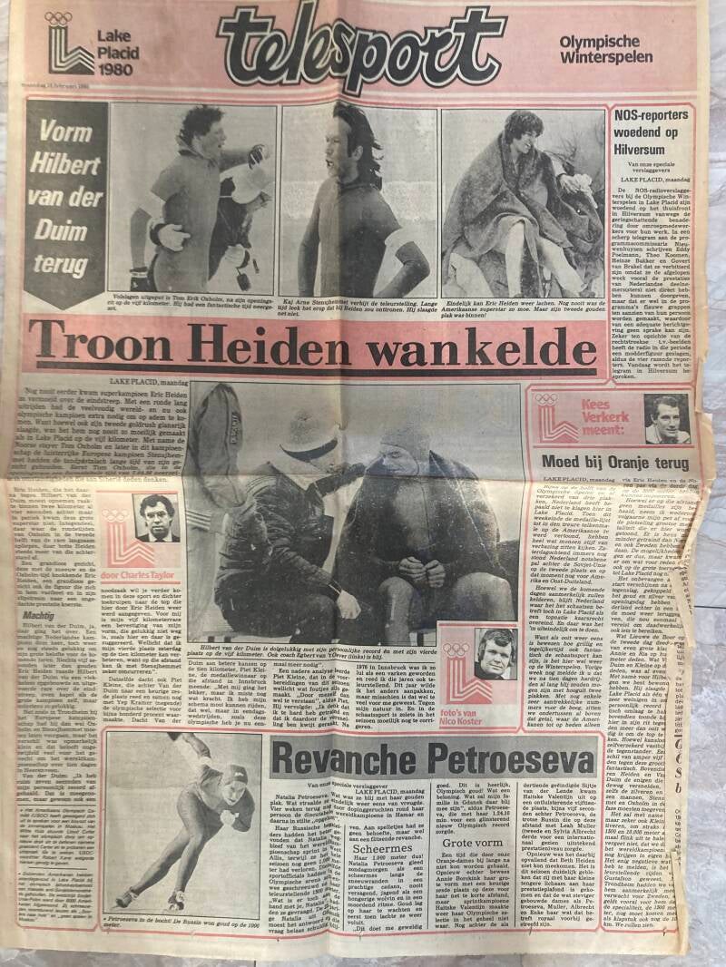 Zo kwam ik ook voor de eerste keer in aanraking met de Amerikaanse schaatser Eric Heiden. Wat een sportman! Wat een held! Ik was toen vooral onder de indruk van zijn eigen manier van trainen in zijn garage. Apparaten werden door Eric Heiden ontwikkeld waarvan we vandaag de dag nog steeds gebruik van maken, zoals de schaatsplank. Mijn moeder wist zich nog te herinneren dat ik dringend op zoek was naar een poster van Eric Heiden voor op mijn kamer, maar daar was toen niet aan te komen. Wel werden er kranten door mij verzameld waarin Eric Heiden stond vermeld. De kranten zijn ondertussen alweer 44 jaar in mijn bezit, maar nog steeds prettig om zo nu en dan deze weer eens te bekijken. Onderaan deze bladzijde zien je meer krantenartikelen.