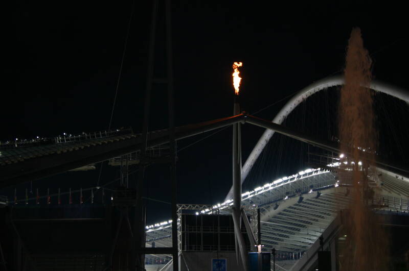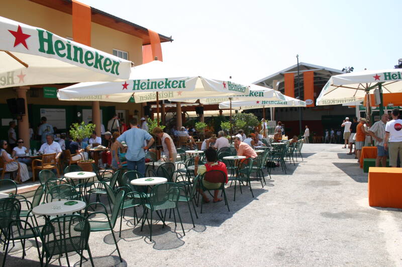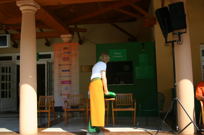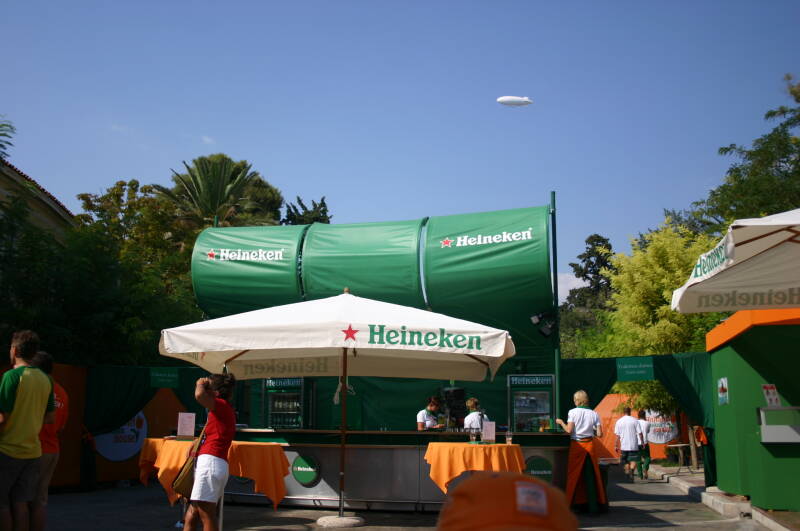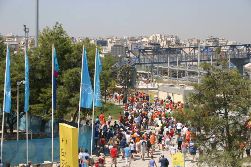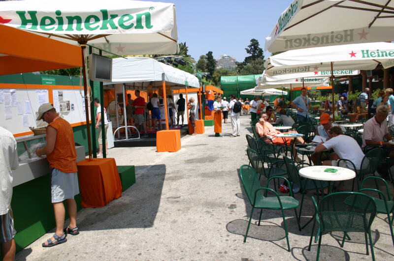 Het Holland Heineken House was geplaatst in het centrum van Athene, naast het Zappeio gebouw in een park, en dichtbij het Panathenaic Stadion waar ooit de Olympische spelen zijn gestart. Mijn Olympisch sporthart begon sneller te kloppen toen ik daar bij de finale van de marathon aanwezig kon zijn. Het Holland Heineken House was deze keer ingedeeld met een feestgedeelte, een winkelstraatje met stoelen en tafels, een restaurant en achter het gebouw een tuin waar op een groot scherm de sporten en de avonduitzending van de NOS met Mart Smeets konden worden gevolgd.